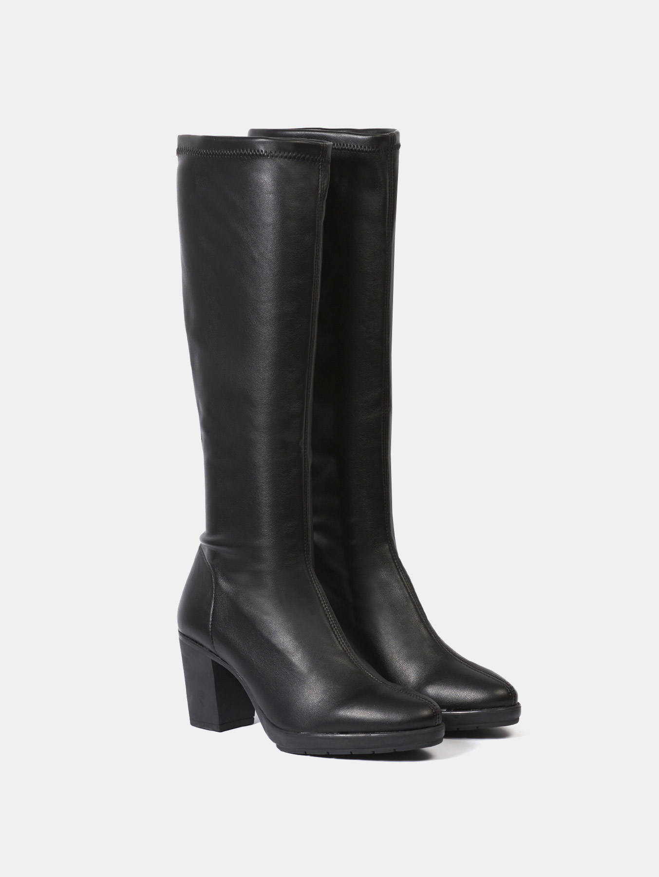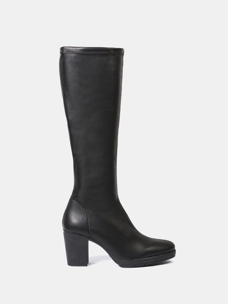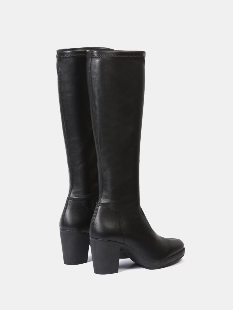 Las botas de tacón modelo Care combinan estilo sofisticado y confort en un diseño Eco-Elástico. Están fabricadas en ante stretch reciclado de color negro. Con un tacón ancho de 5 cm, aportan una altura elegante sin comprometer la comodidad. Fabricadas en España con materiales sostenibles, estas botas reflejan un compromiso con la moda ética, ideales para elevar cualquier look.