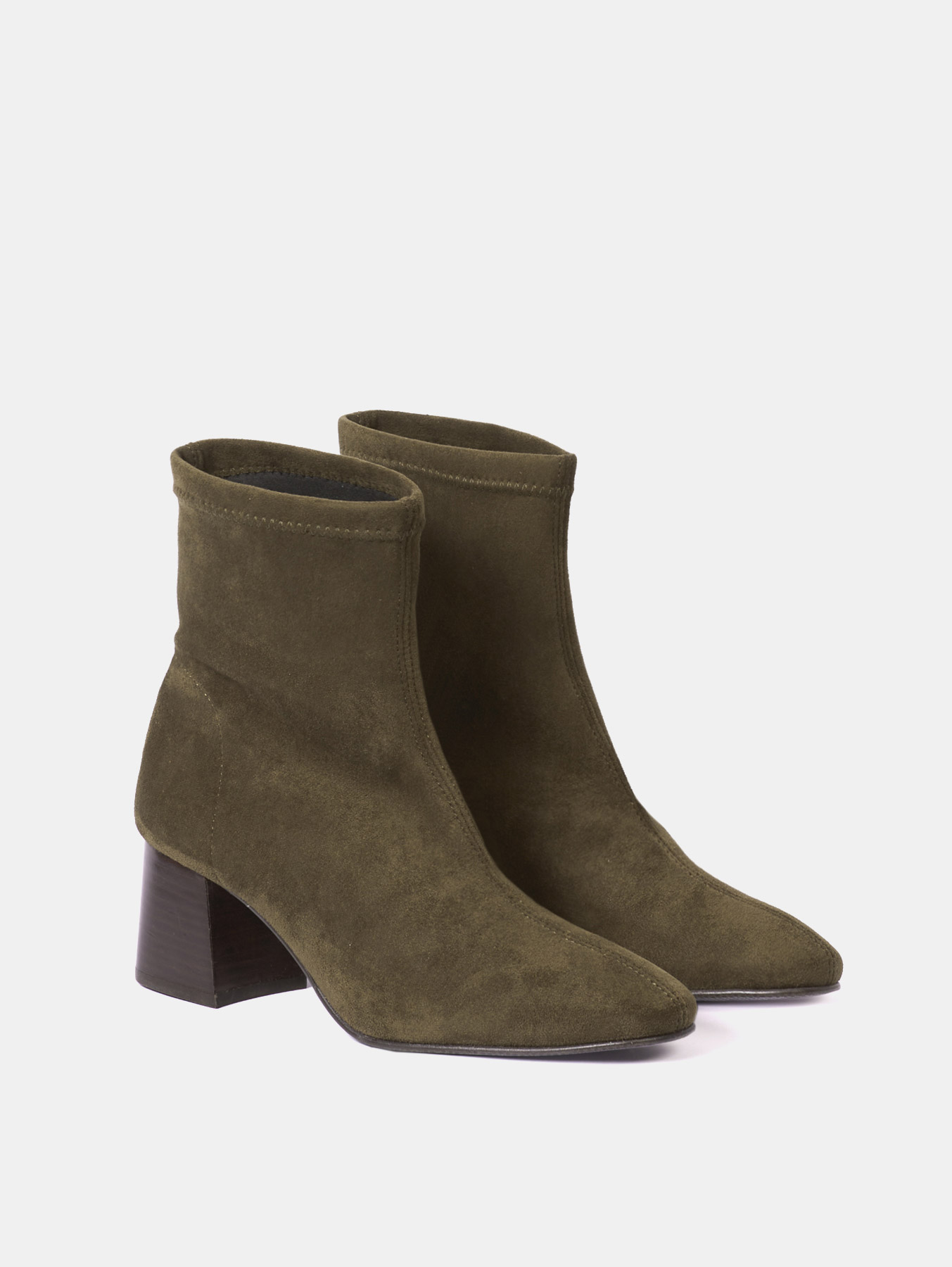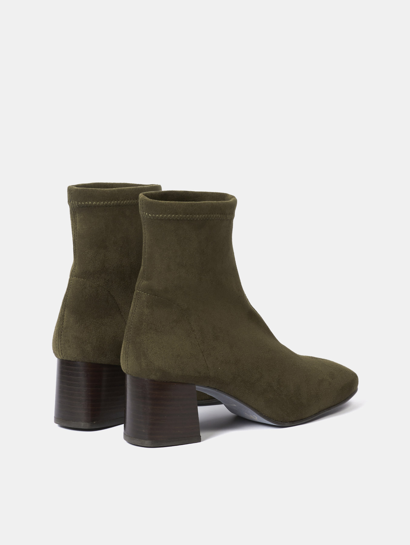 Los botines de tacón modelo Millie combinan estilo sofisticado y confort en un diseño Eco-Elástico de ante reciclado. Están fabricadas en ante stretch reciclado de color verde oscuro. Con un tacón ancho de 5 cm, aportan una altura elegante sin comprometer la comodidad, mientras la puntera fina añade un toque moderno. Fabricadas en España con materiales sostenibles, estas botas reflejan un compromiso con la moda ética, ideales para elevar cualquier look.